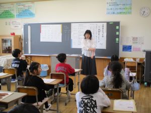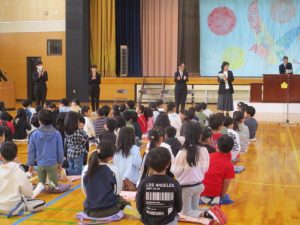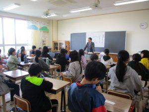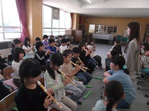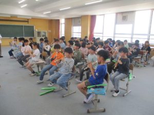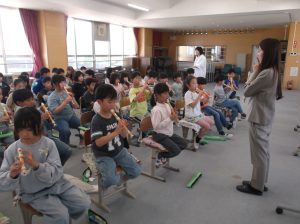 3年生の音楽の授業から,リコーダーの演奏の学習が始まります。その初めの授業として,ヤマハの沖田様を講師に迎え,3年生にリコーダーの演奏についての教室をしていただきました。姿勢やリコーダーの持ち方から,息の吹き入れ方(タンギングの基礎)の指導をしていただきました。