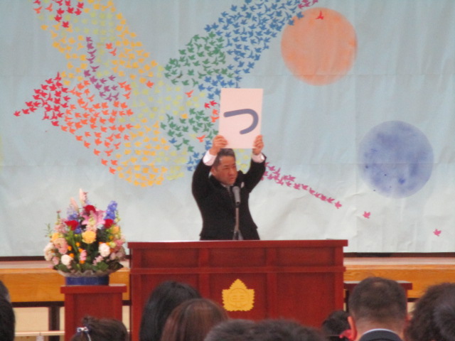 続いて,始業式です。校長の話の中で,今年のテーマが発表されました。