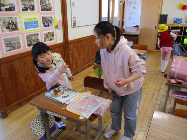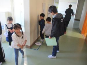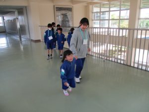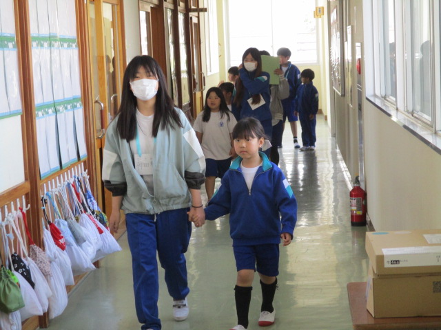 今週,6年生が1年生に学校案内をしていました。