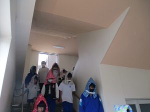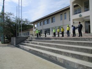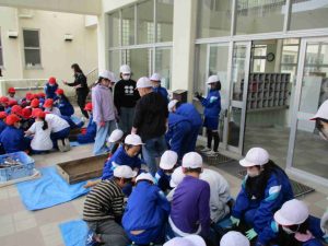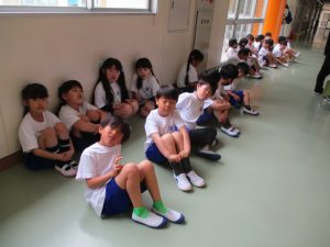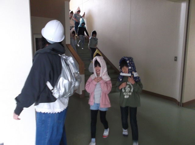 複数の学年が重なる階段の避難は3階に教室のある5・6年生が内側,2階に教室のある3・4年生が外側を下りることで,学年どうしが交差することなく避難できました。子供たちの避難の様子から反省点を見つけられ,次の訓練へ課題をもつことのできた訓練となりました。