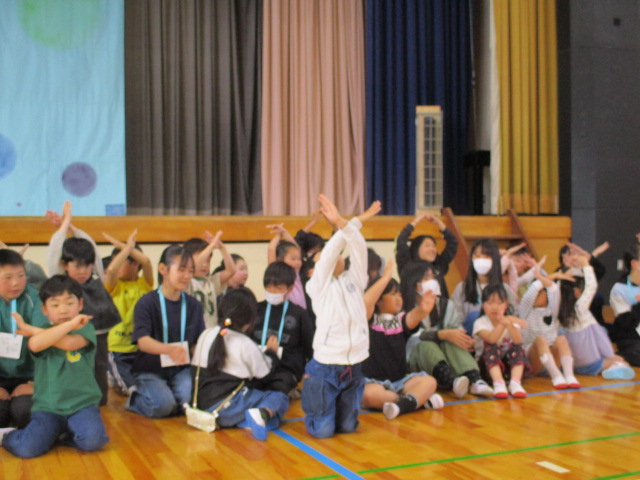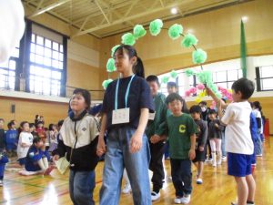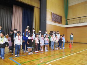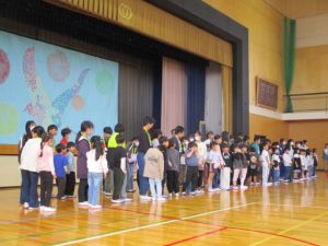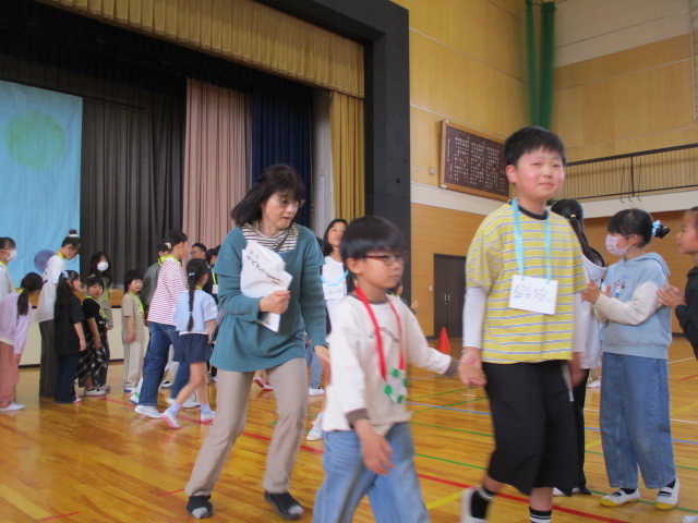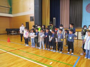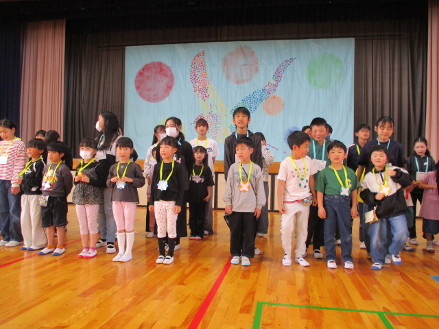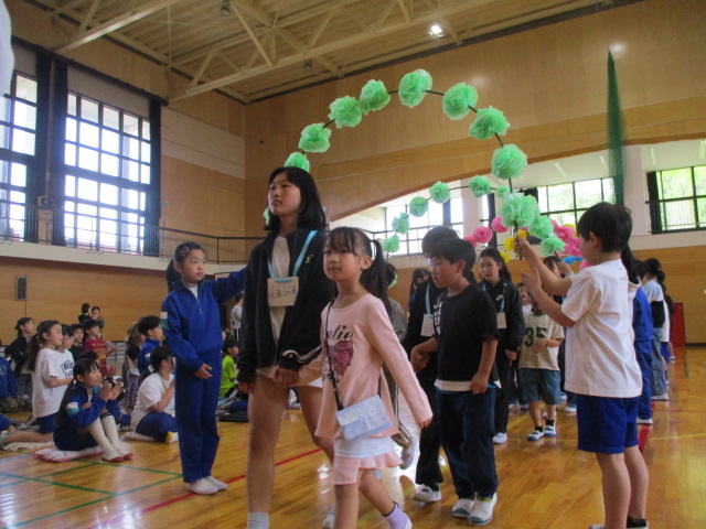 1年生と6年生で入場し,児童会本部や校長からの歓迎の言葉,1年生の紹介と続き,八田小〇✕クイズで盛り上がりました。6年生が作ったメダルをプレゼントされ,全校で「さんぽ」を歌いました。