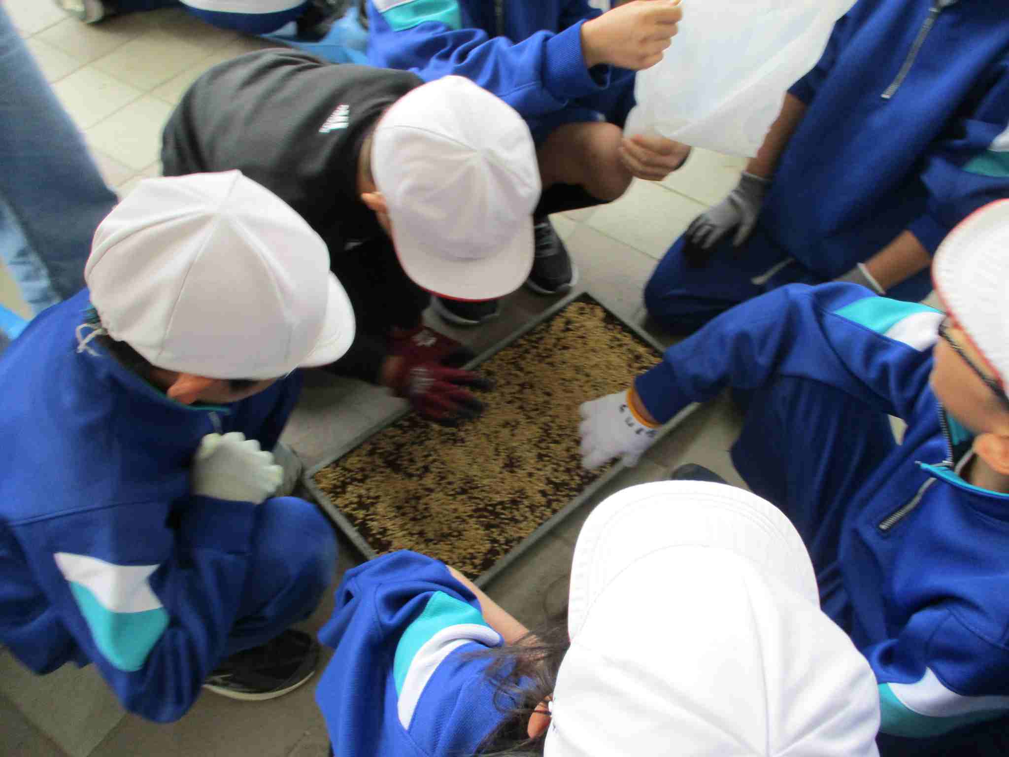 苗を購入して田植えをする学校が多い中,本校は,苗床にもみをまき,苗を育てるところから貴重な体験をしていきます。これから秋の収穫まで,様々な体験をしながら学習を進めていきます。井上先生よろしくお願いします。