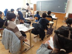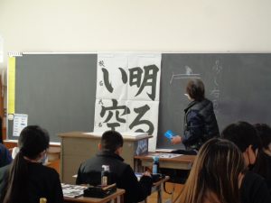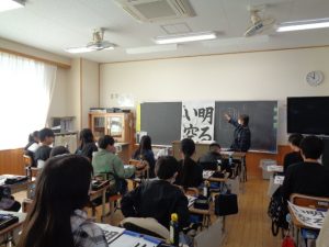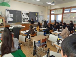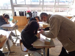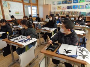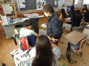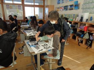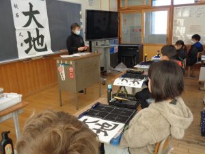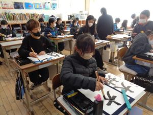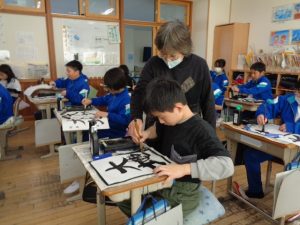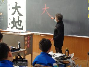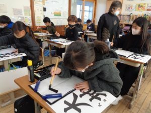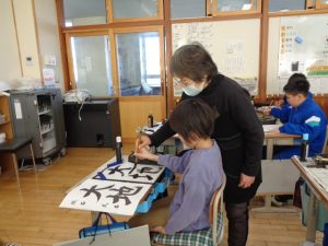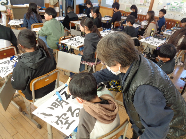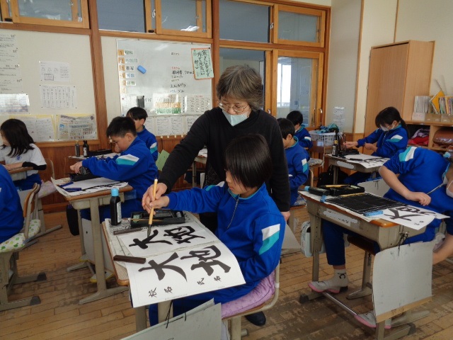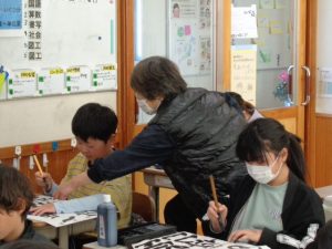 全体での指導と,一人一人へのていねいな指導をしていただきました。ご指導を生かして練習し,書き初めではいい結果につげたいと思います。2日にわたってのご指導をありがとうございました。