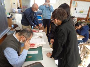 硬い石を専用の刃物で彫ることの難しさを感じながら,印章組合の皆様にご指導いただき,世界に一つだけのはんこができました。山梨の伝統工芸「甲州手彫印章」を学び,印章組合の皆様の「匠の技」を目の前で見ることもでき,貴重な体験をすることができました。印章組合の皆様ありがとうございました。