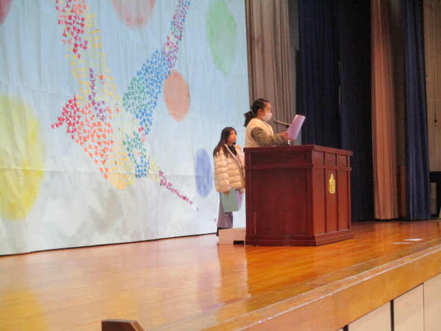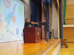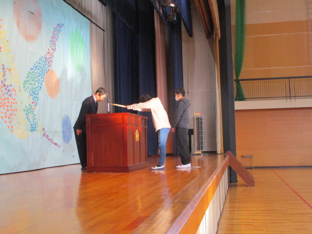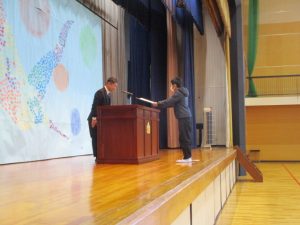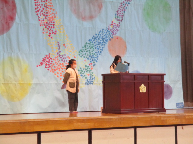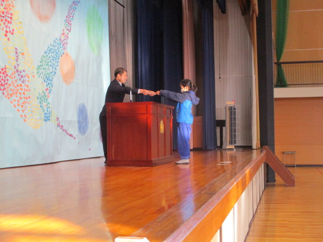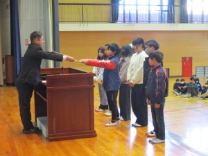 終業式の前に,賞状の伝達式と来年度の児童会役員の任命式をしました。