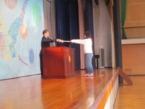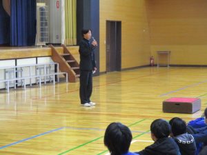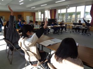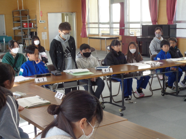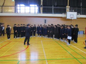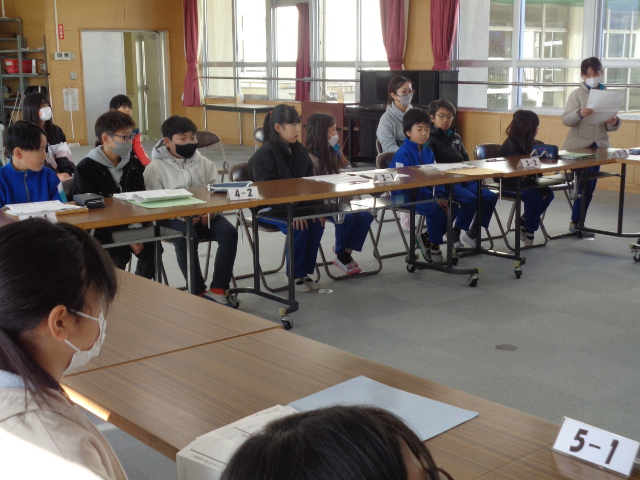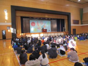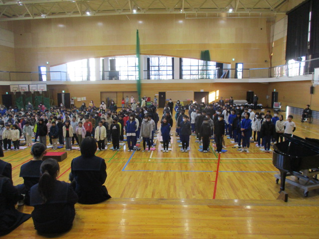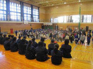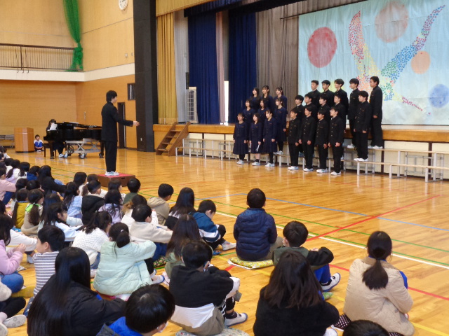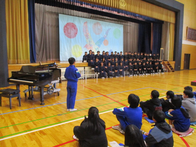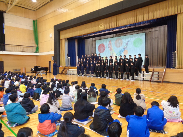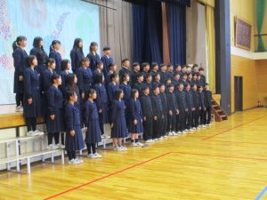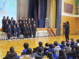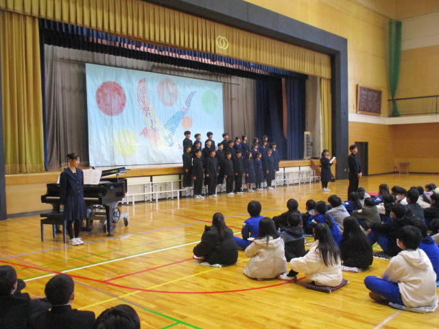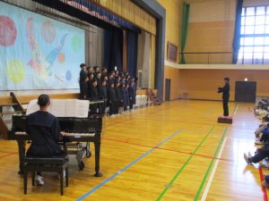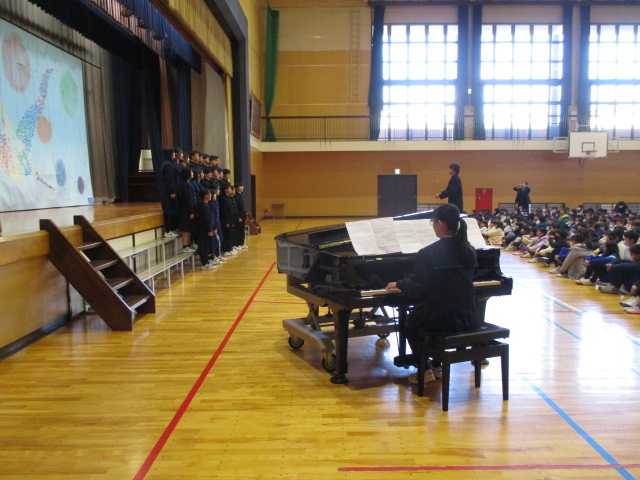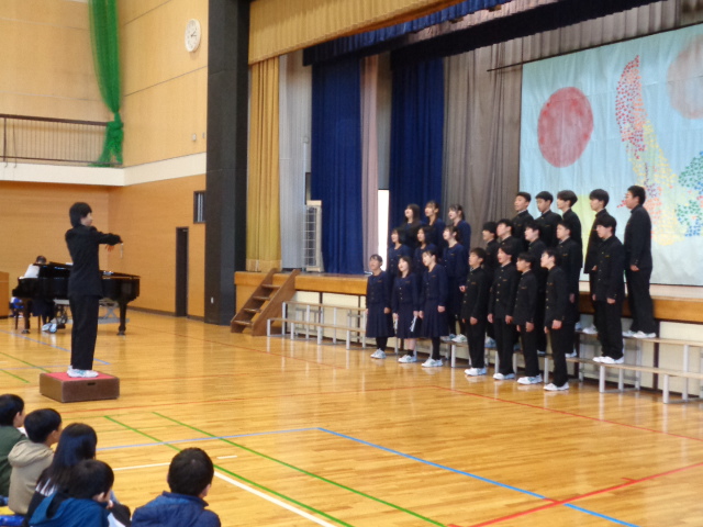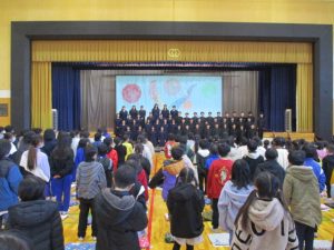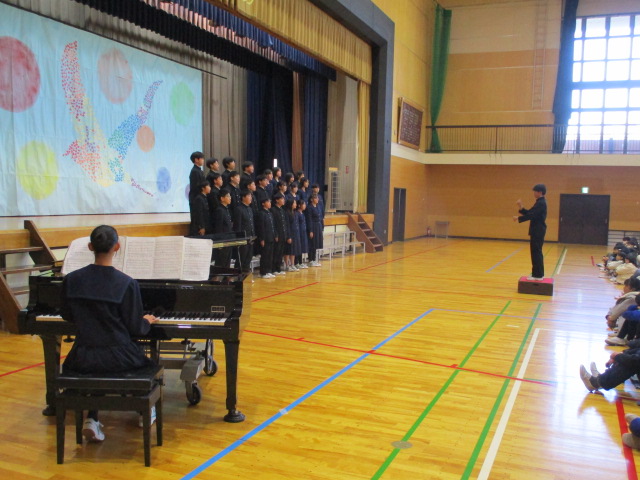 中学生から,学年合唱・クラス合唱(1組・2組)の披露があり,八田小児童の全校合唱を聞いてもらい,最後に,全員で八田小校歌を歌いました。