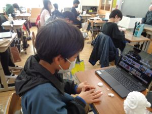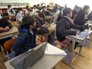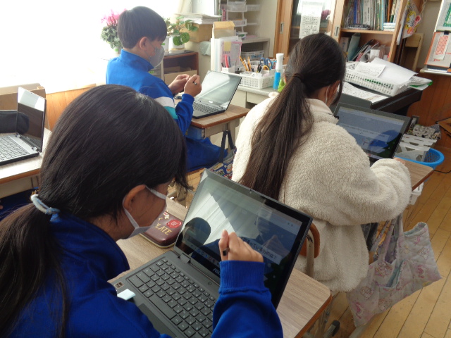 新しいクロームブックを使い始めました。6年生のようすです。6年1組は各自でログインし,使えることを確認しているしているようす,6年2組はインターネットの画像などを参考に図工の制作をしているようすです。