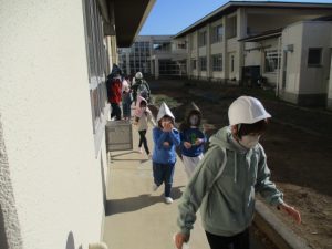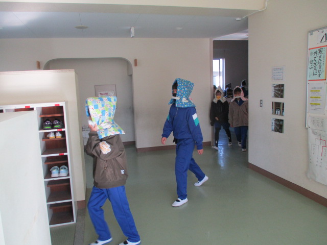 火災が起きた場合を想定しての避難訓練を行いました。校舎の東端の家庭科室から出火したという想定で行いましたので,2階と3階に教室のある3~6年生は,東側の階段を避難には使わず,西側の階段を下り,西側の玄関から避難しました。1階に教室のある1・2年生は中庭・犬走りに出て,西側を通って避難しました。