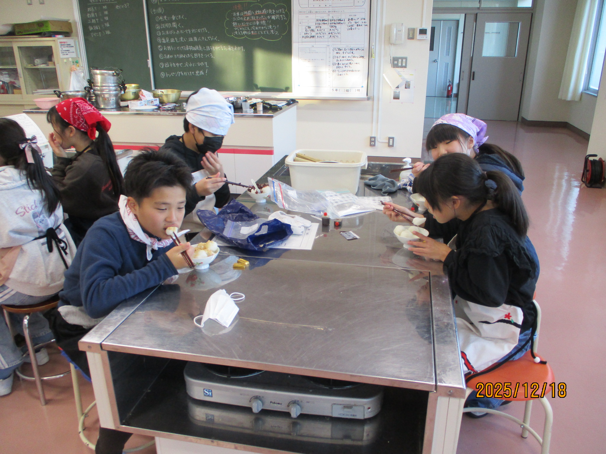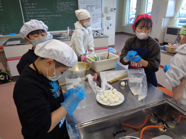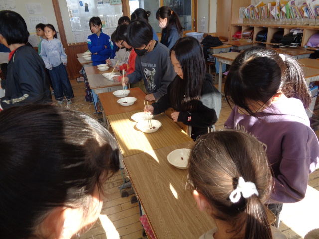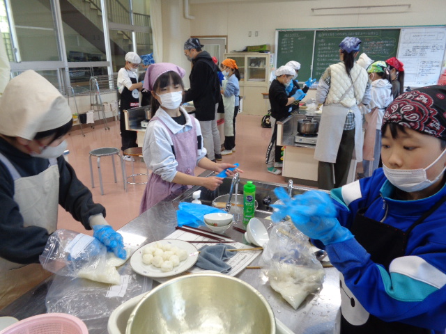 5年生は米作りに取り組んできました。その最後の取り組みとして,お世話になった井上先生・三枝様・篠原様をお招きして「感謝の会」を計画していました。しかし,インフルエンザが蔓延してしまい,残念ながら中止としましたが,元気に登校している5年2組は計画していた「ごはん団子」づくりに取り組みました。